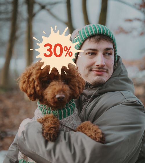 Ein brauner Pudel, eingewickelt in eine weiße Decke, sitzt neben einem Weihnachtsbaum. Rechts davon befindet sich eine kreisförmige Grafik mit bunten Illustrationen und Text.